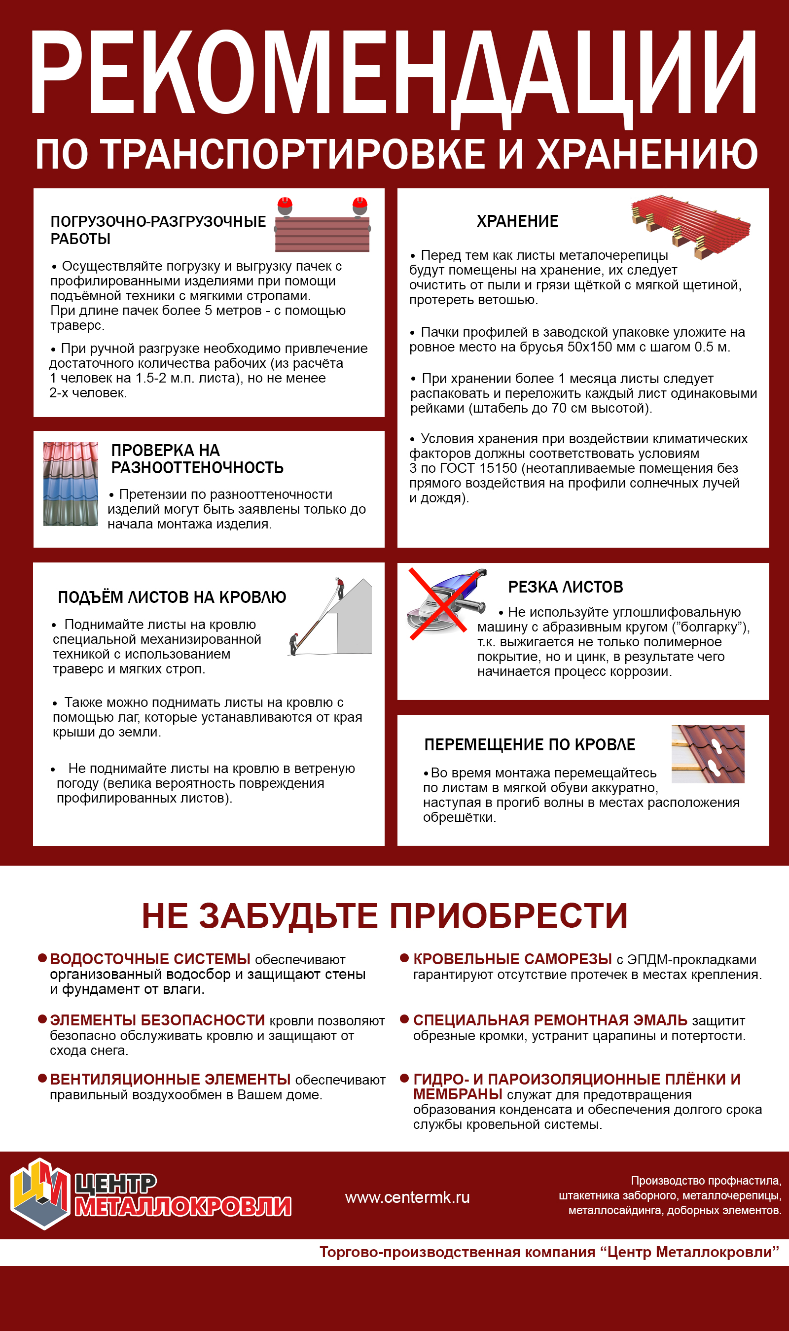 Металлочерепицу начинают монтировать с нижнего угла прямоугольного ската, со стороны, противоположной капиллярной канавке. Канавка устраняет капиллярный эффект, когда вода поднимается по капилляру, образованному двумя плотно прижатыми листами металлочерепицы.