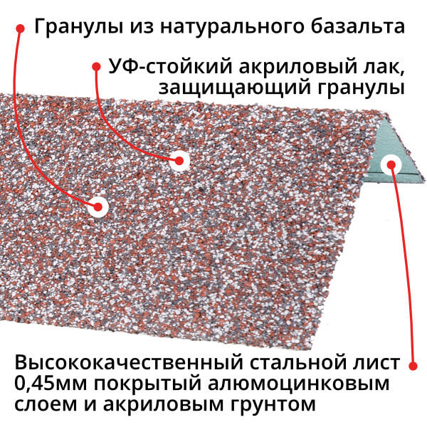 Оконный наличник изготовлен из высокопрочного стального листа толщиной 0,45 мм. С обоих сторон изделие покрыто алюмоцинковым сплавом. Покрытие внешней стороны – базальтовый гранулят. Наличник не подвержен коррозии и не будет окисляться даже в месте среза при монтаже, а также в случае появления царапин на слое.