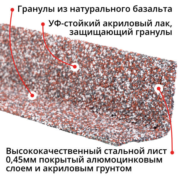 Внутренний уголок изготовлен из высокопрочного стального листа толщиной 0,45 мм. С обоих сторон изделие покрыто алюмоцинковым сплавом. Покрытие внешней стороны – базальтовый гранулят. Уголок не подвержен коррозии и не будет окисляться даже в месте среза при монтаже, а также в случае появления царапин на слое.
