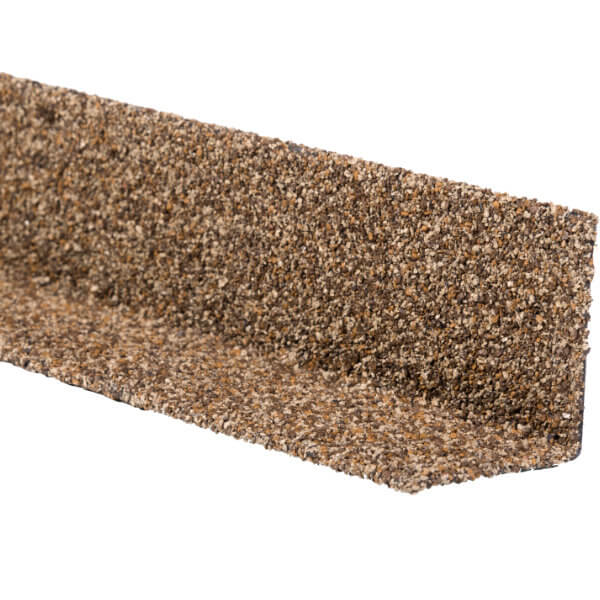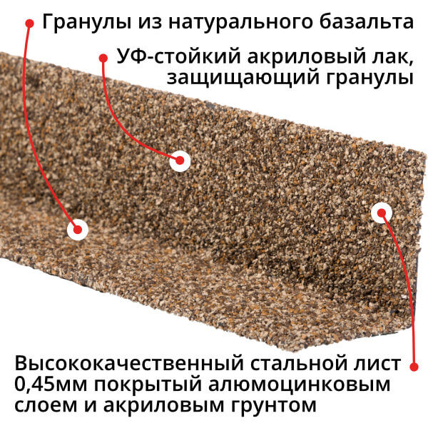 Внутренний уголок изготовлен из высокопрочного стального листа толщиной 0,45 мм. С обоих сторон изделие покрыто алюмоцинковым сплавом. Покрытие внешней стороны – базальтовый гранулят. Уголок не подвержен коррозии и не будет окисляться даже в месте среза при монтаже, а также в случае появления царапин на слое.