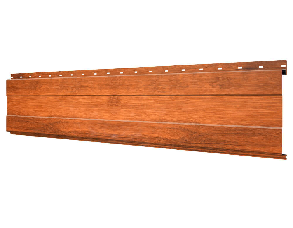 Линеарная потолочно-стеновая панель с ПОЛОСОЙ усиленная цвет под дерево Кедр Темный 3Д SteelArt Россия применяется в качестве софитов для подшивы крыши, наружной и внутренней отделки потолков, стен, фронтонов фасада дома в Рязани.