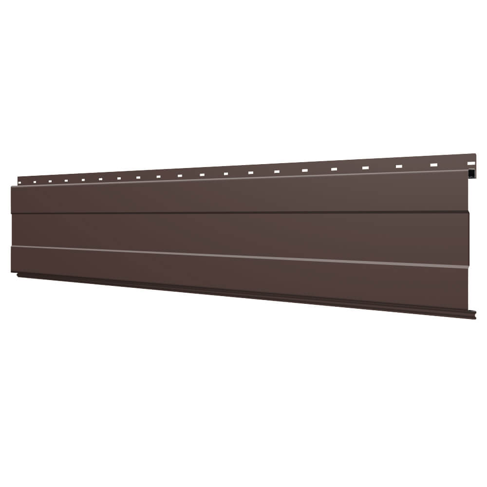 Линеарная потолочно-стеновая панель с ПОЛОСОЙ усиленная цвет RAL8017 Шоколад применяется в качестве софитов для подшивы крыши, наружной и внутренней отделки потолков, стен, фронтонов фасада дома в Рязани.