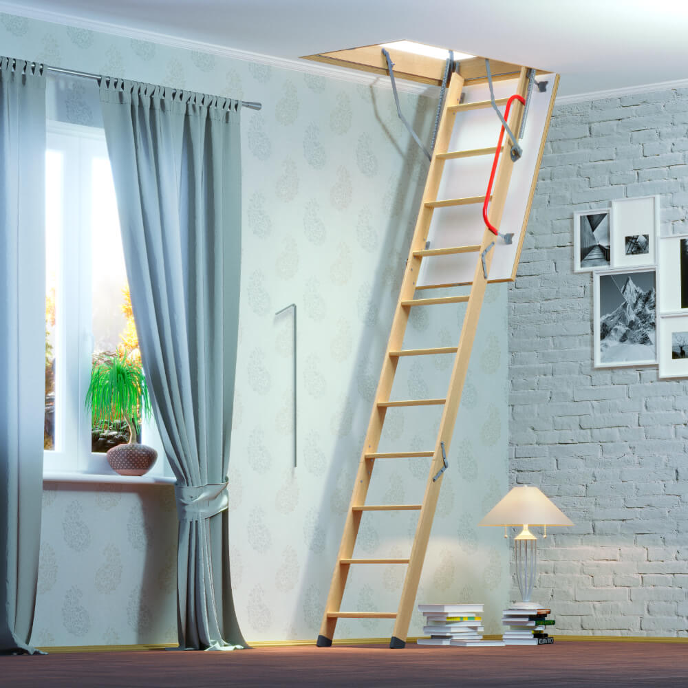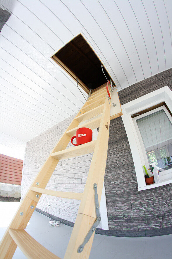 Древесина хвойных пород и белый люк позволяют лестнице вписаться в любой интерьер. В сложенном виде лестница не занимает много места, а крышка люка становится почти незаметна.