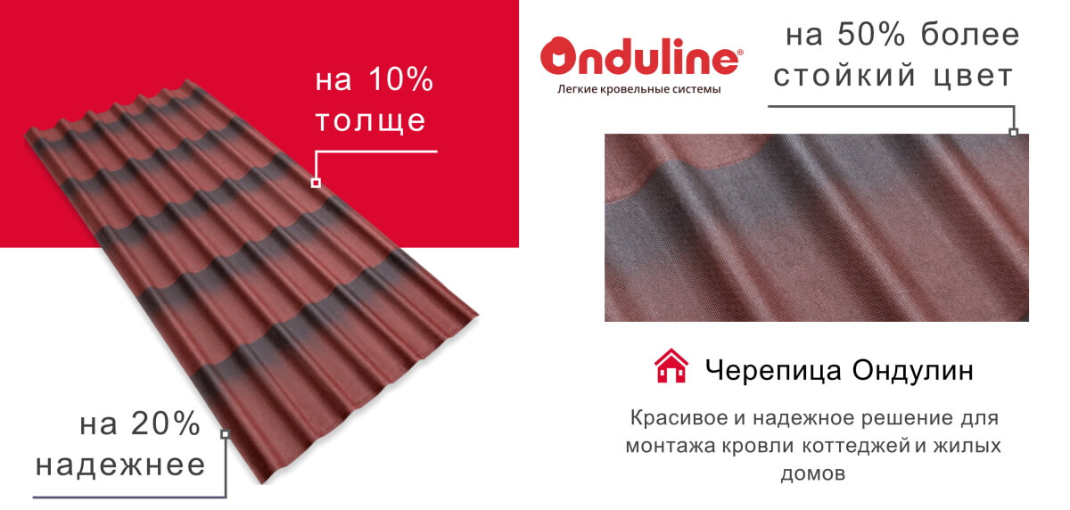 Черепица Ондулин отличается долговечностью (срок службы может достигать 50 лет), экологичностью, высокими гидроизолирующими свойствами, прочностью. Выдерживает вес снега до 960 кг/м2, силу ветра — до 354 км/ч.