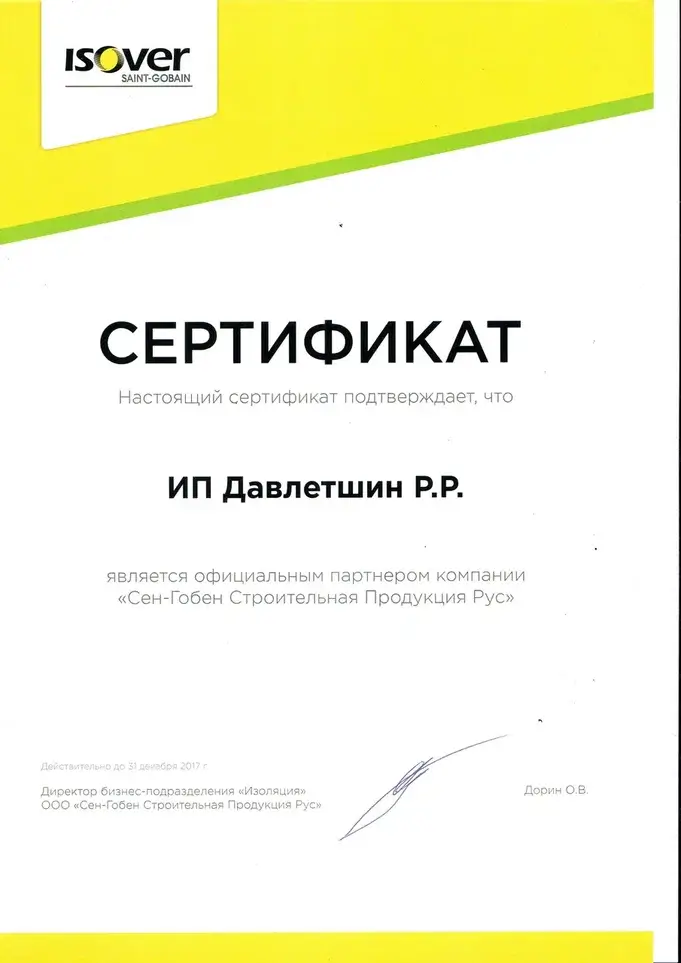 Сертификат партнера ISOVER