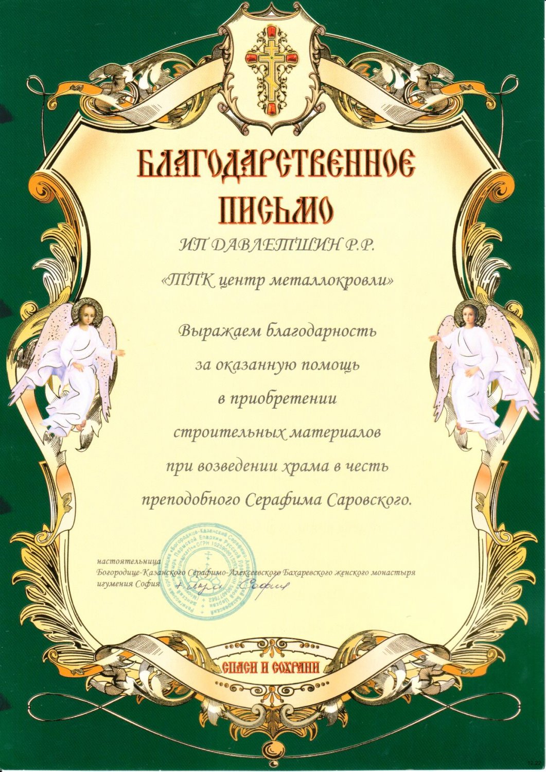 Благодарственное письмо от Богородице–Казанского Серафимо–Александровского Бахаревского женского монастыря