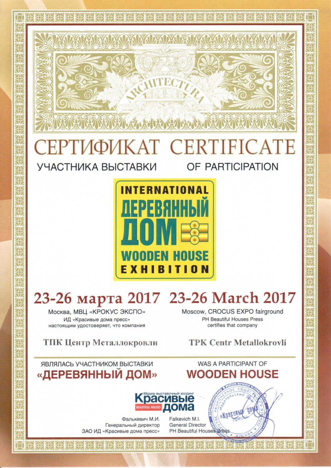 Сертификат участника выставки «Деревянный дом»
