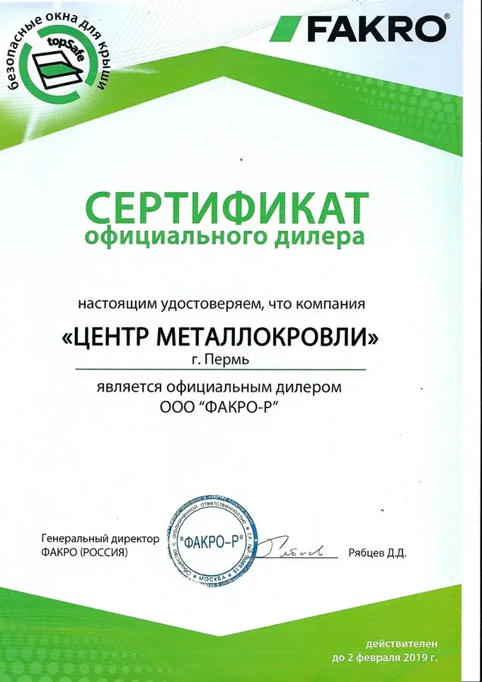 Сертификат дилера FAKRO