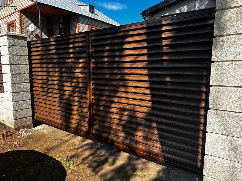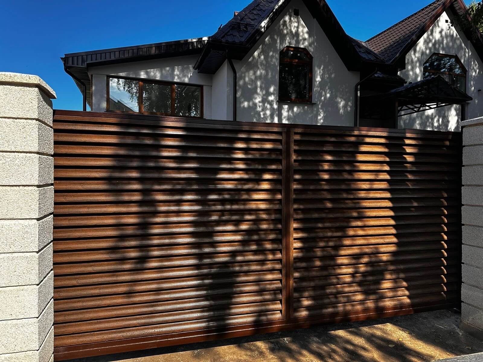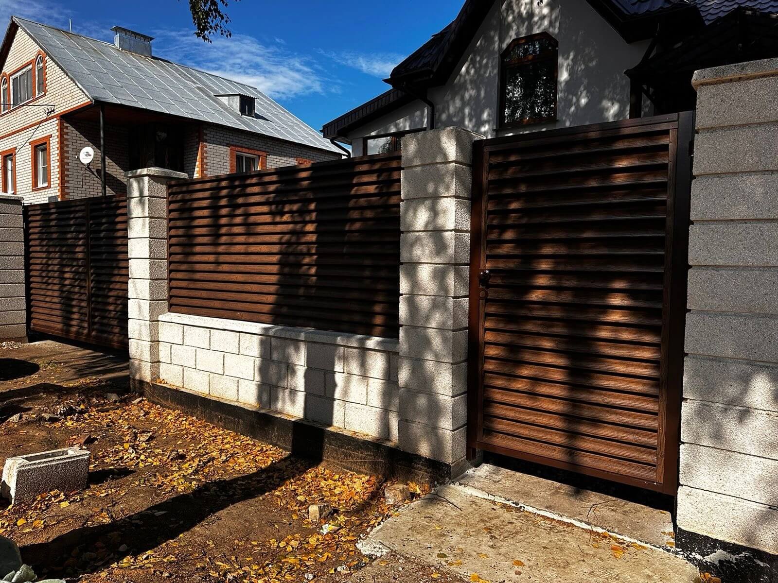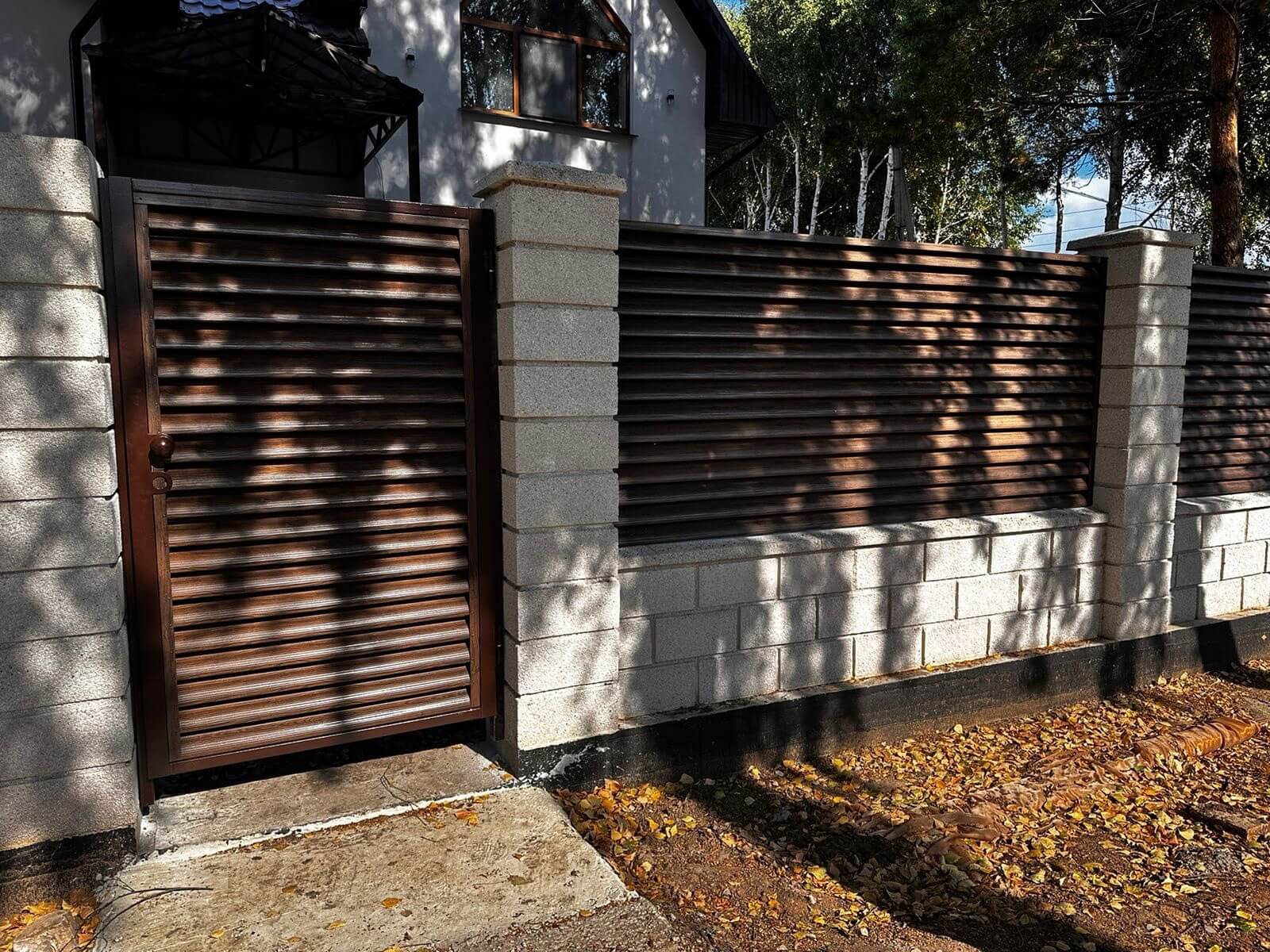Секция забора жалюзи из ламелей еврожалюзи Темный Каштан 3D Принтек с кирпичными столбами анфас односторонний