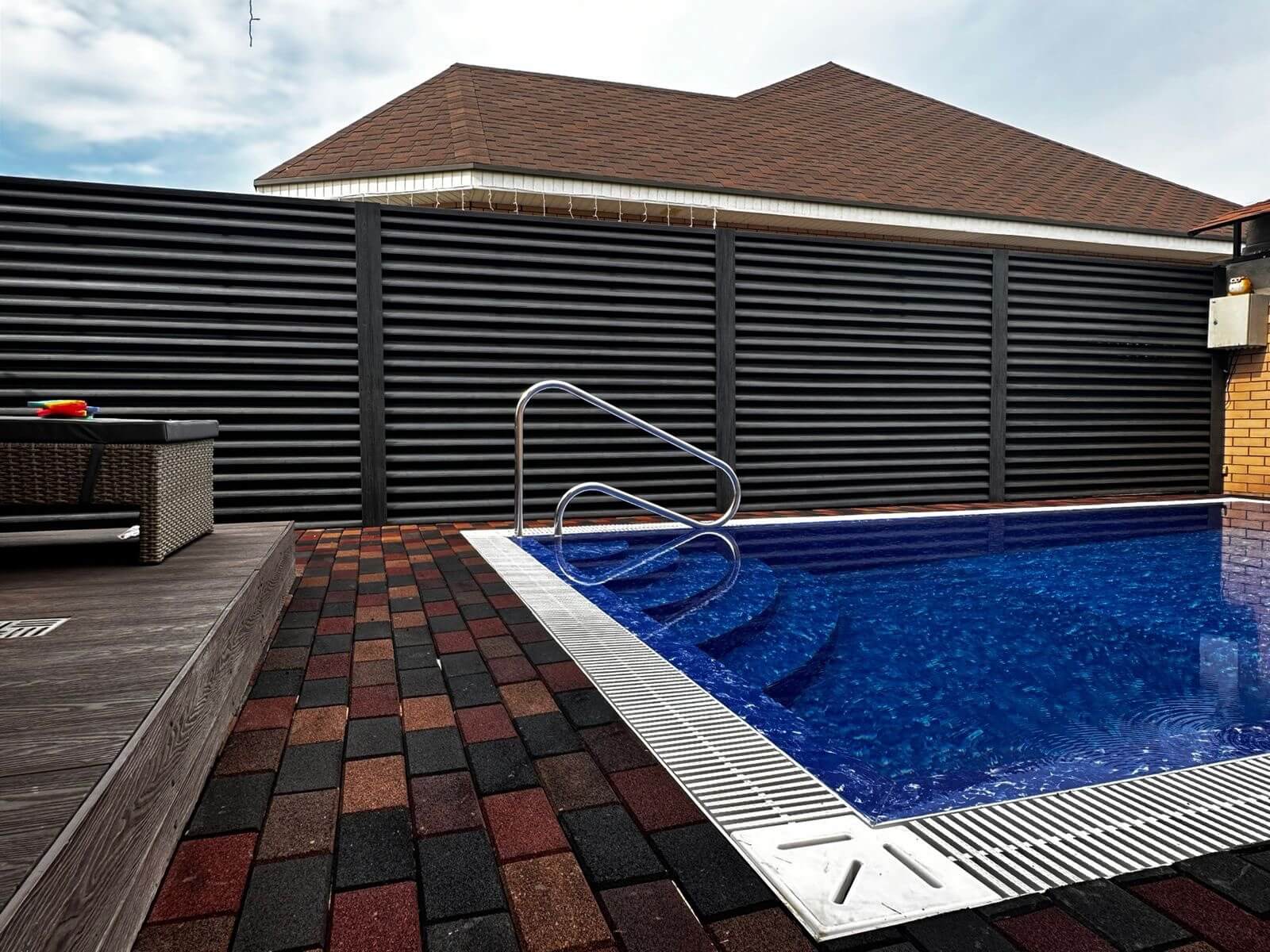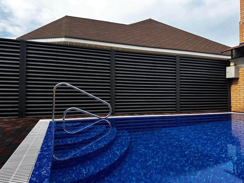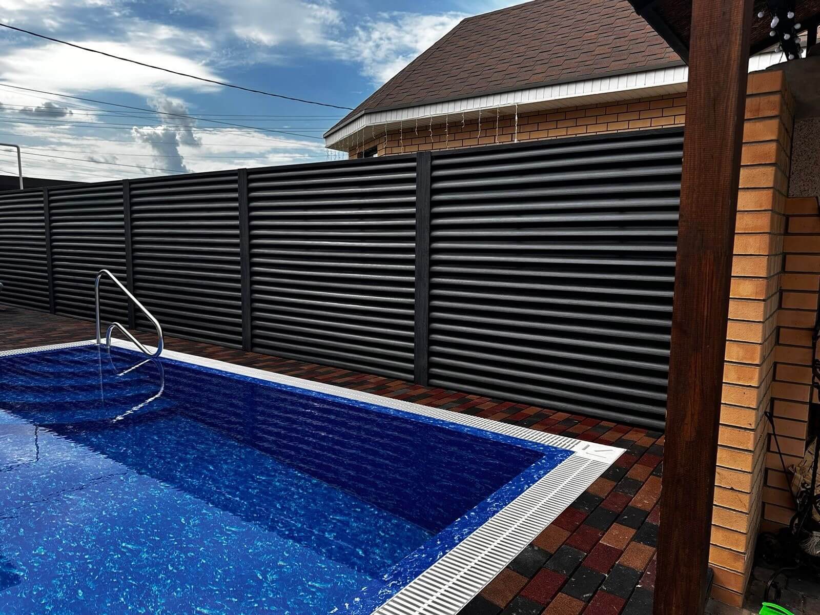Секция забора жалюзи из ламелей еврожалюзи Черное Дерево 3D Принтек с кирпичными столбами анфас двусторонний Вид спереди забор ламели еврожалюзи Черное Дерево Принтек односторонний Вид сзади забор ламели еврожалюзи Черное Дерево Принтек односторонний Ламели еврожалюзи Черное Дерево 3D Принтек односторонний сертификат Ламель Еврожалюзи Черное Дерево 3D односторонний для заборов-жалюзи, беседок, пергол
