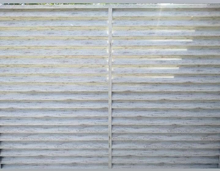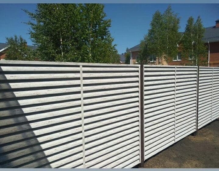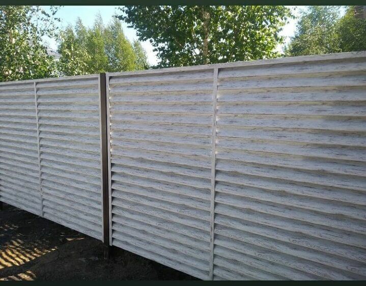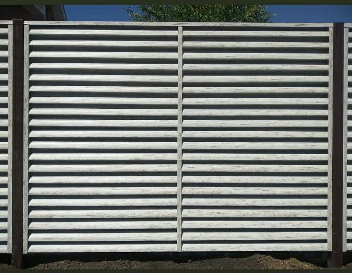 Забор-жалюзи с ламелями Еврожалюзи от ТПК Центр Металлокровли цвет Белёный Дуб ⠀ ✅ Забор установлен в городе: Тюмень ✅ Вид секции: забор-жалюзи ✅ Столбы: металлическая профильная труба ✅ Профиль металлических ламелей: Еврожалюзи ✅ Цвет и покрытие ламелей: цвет Белёный Дуб